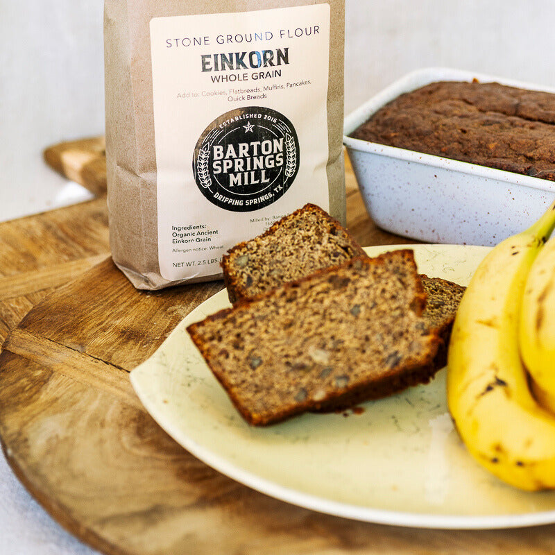Banana nut bread featuring our organic Einkorn ancient grain and organic All-Purpose flour. A staple for your weekly bakes!