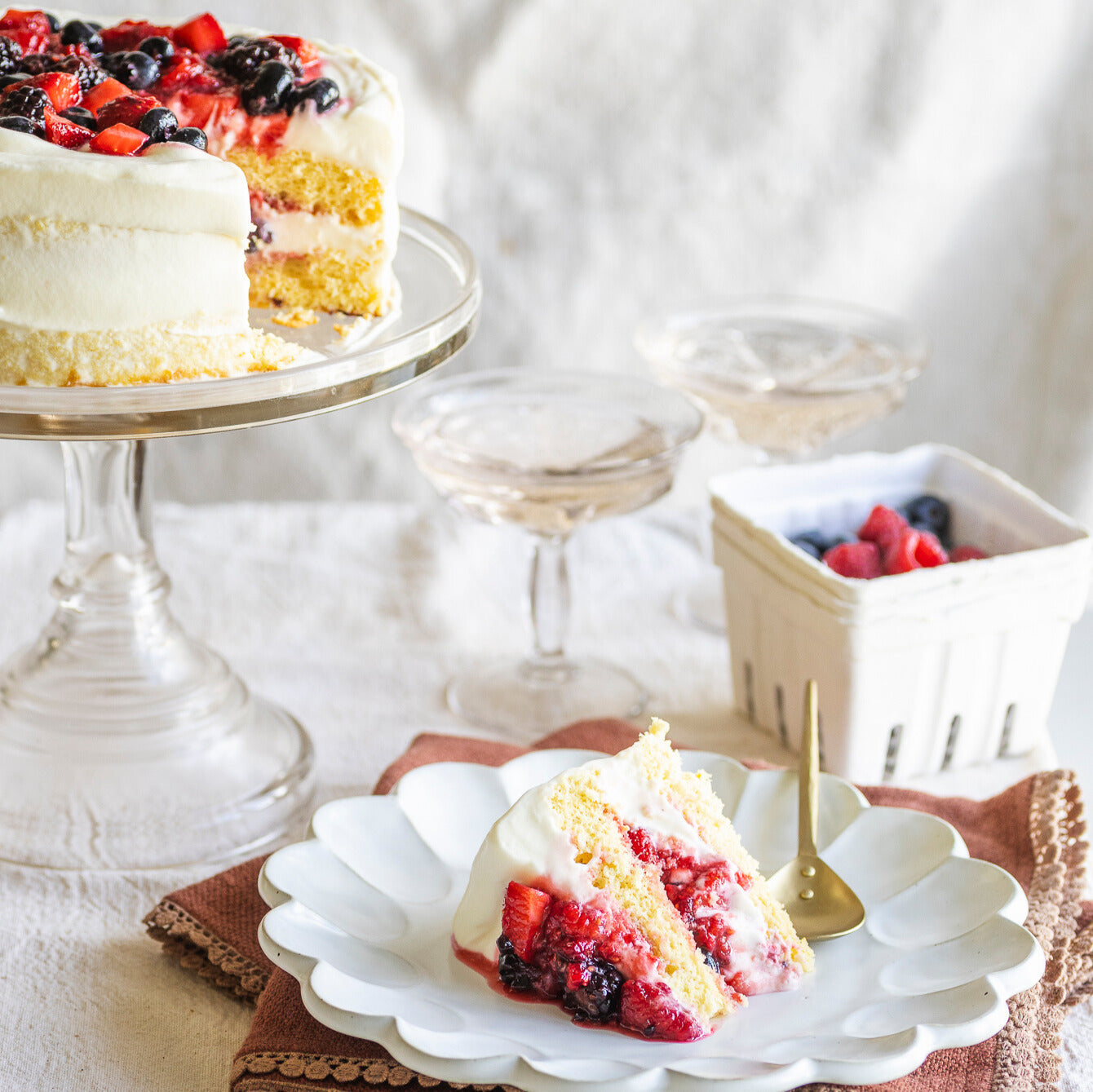 A quintessential spring dessert. The BSM Test Kitchen Chantilly cake recipe uses our organic Sonora 00 flour for a delicious chiffon cake that is full of fresh berries, and coated in a light and creamy mascarpone whipped cream.