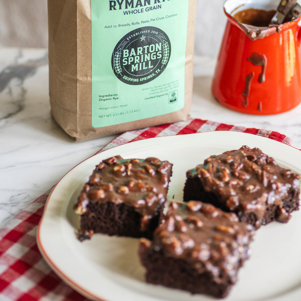 A rich Texas sheet cake made with our organic whole grain Ryman rye flour. Yes, that's right....made with ALL rye flour! This fudgy chocolate cake coated in a decadent chocolate pecan frosting is the elevated TX sheet cake that even your Memaw can nod her head.